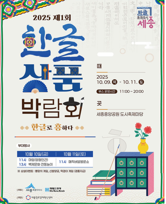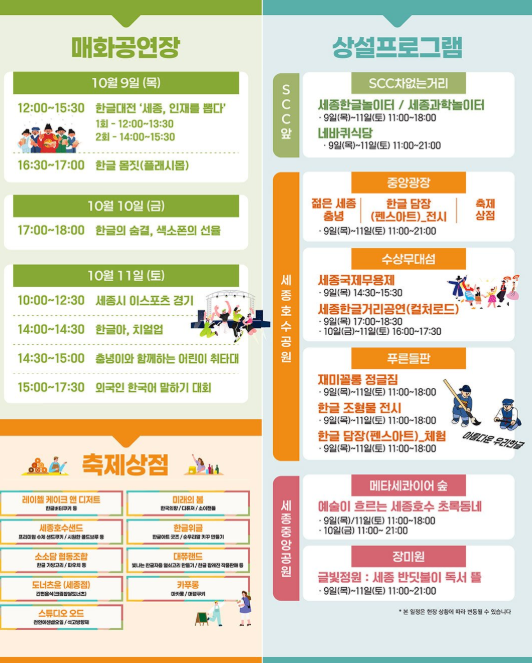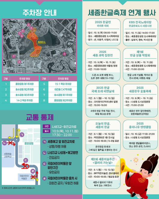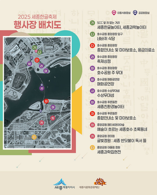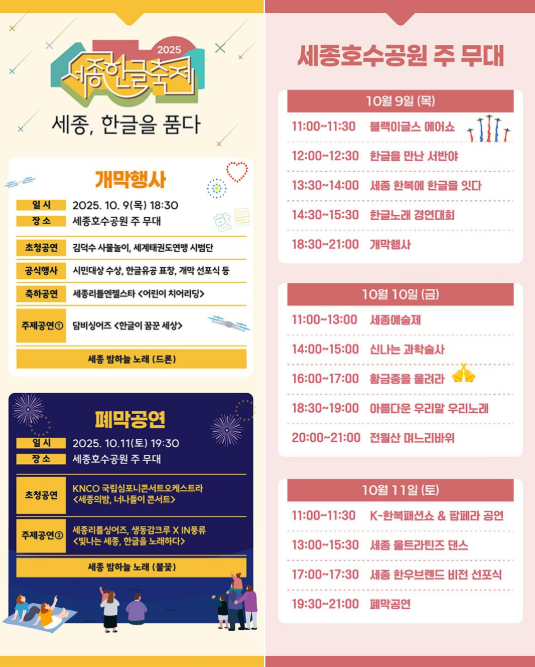 올해로 새롭게 이름을 바꾼 2025 세종한글축제가 10월 9일(목)부터 11일(토)까지 세종호수공원 일대에서 열립니다.예전에는 세종축제로 불렸는데, 올해부터는 한글이라는 주제를 중심으로 완전히 새롭게 꾸며집니다.