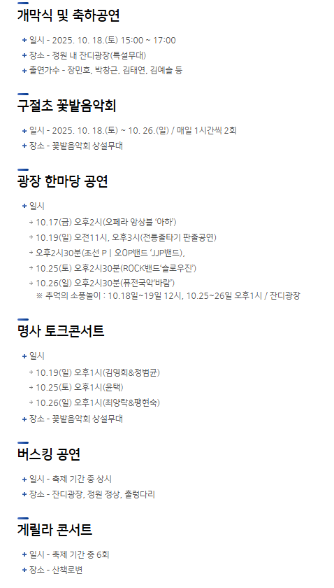 꽃밭음악회는 10월 18일부터 26일까지 매일 2회씩 펼쳐지며, 관람객은 자연 속에서 클래식, 가요 등 음악을 즐길 수 있다.