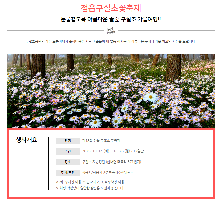 2025년 제18회 정읍 구절초 꽃축제는 10월 14일(화)부터 10월 26일(일)까지 13일간 정읍시 산내면 매죽리 571번지의 구절초 지방정원에서 열린다.