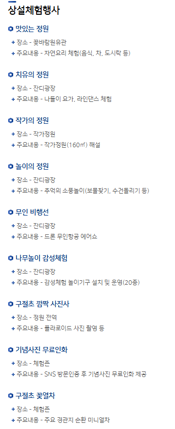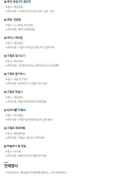 그 외에도 꽃멍 정원 멍, 나무놀이 감성체험, 목공예 체험, 향기 박스 만들기, 족욕 체험 등 감성 중심 체험이 마련된다. 축제장에서는 구절초차, 구절초비누 등 지역 특산품 판매 부스도 마련되어 있어 기념품을 구매하기 좋다.