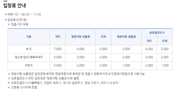 매표 및 개장 시간은 오전 8시 30분부터 오후 5시 30분까지이며, 정읍 시민은 신분증 제시 시 무료 입장이 가능하다.