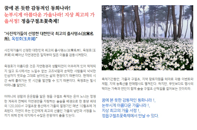 전북 정읍을 대표하는 가을 축제- 정읍 구절초축제가 올해도 화려하게 돌아온다. 2025년 축제는 정읍 내장산 자락의 구절초테마공원에서 열린다. 수백만 송이의 하얀 구절초가 산자락을 뒤덮으며 가을 정취를 선사한다.