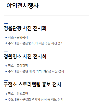 구절초는 예로부터 약재로 사용돼 왔으며, 은은한 향과 단정한 흰빛으로 가을의 상징처럼 여겨진다. 축제 기간에는 내장산 자락의 자연 경관과 어우러져 한층 더 고요하고 아름다운 풍경을 감상할 수 있다. 아침 안개가 내려앉은 구절초밭은 마치 동화 속 장면을 연상케 한다. 방문객들은 자연 속 산책로를 따라 걸으며 정읍의 맑은 공기와 함께 마음의 안정을 얻을 수 있다. 구절초 사진 콘테스트나 전통차 시음 등 감성적인 프로그램도 운영돼, 하루 머물러도 지루하지 않다. 근처에는 캠핑장과 펜션이 있어 1박 2일 여행으로도 알맞다.