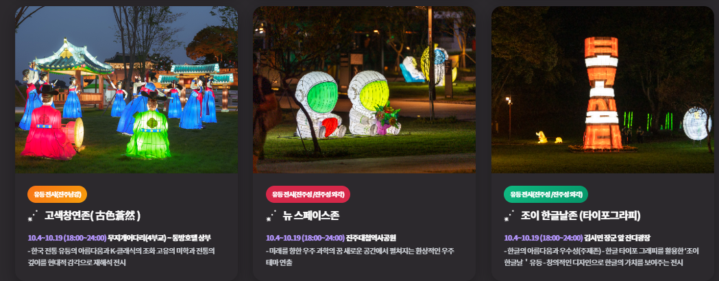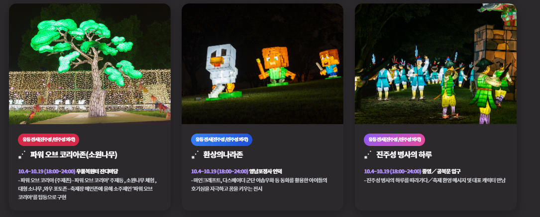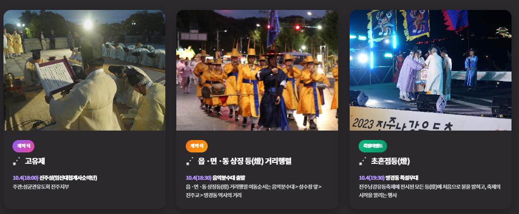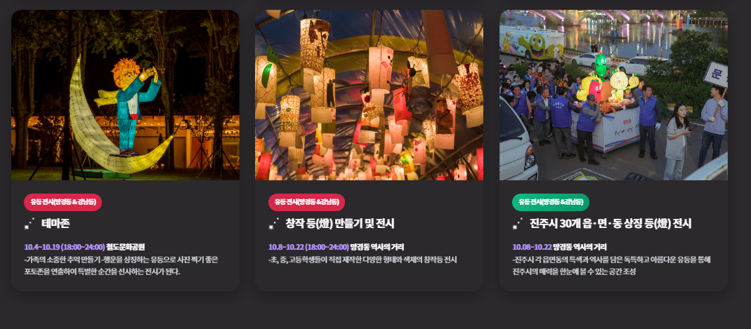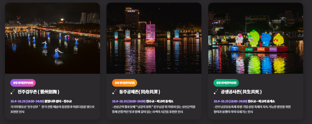 이처럼 유등축제는 과거의 전통을 현대적으로 계승하며, 진주를 ‘빛의 도시’로 만드는 대표적인 문화 행사로 자리매김하고 있습니다.