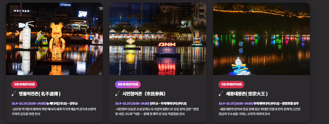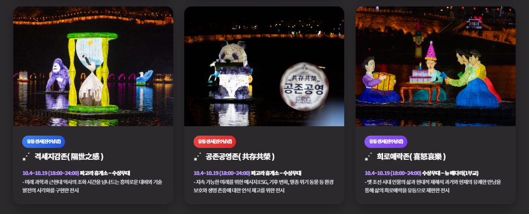 유등 만들기, 소망등 달기 등 다양한 체험존도 운영되며, 일부는 사전 신청이 필요할 수 있으니 공식 홈페이지 공지를 꼭 확인하시는 것이 좋습니다.