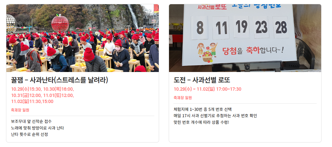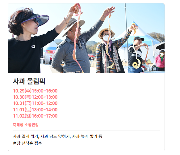 축제 기간에는 황금사과를 찾아라, 도전 – 사과 선별 로또, 꿀잼 – 사과 난타 등 방문객이 직접 체험하고 즐길 수 있는 참신한 프로그램이 준비되어 있다.