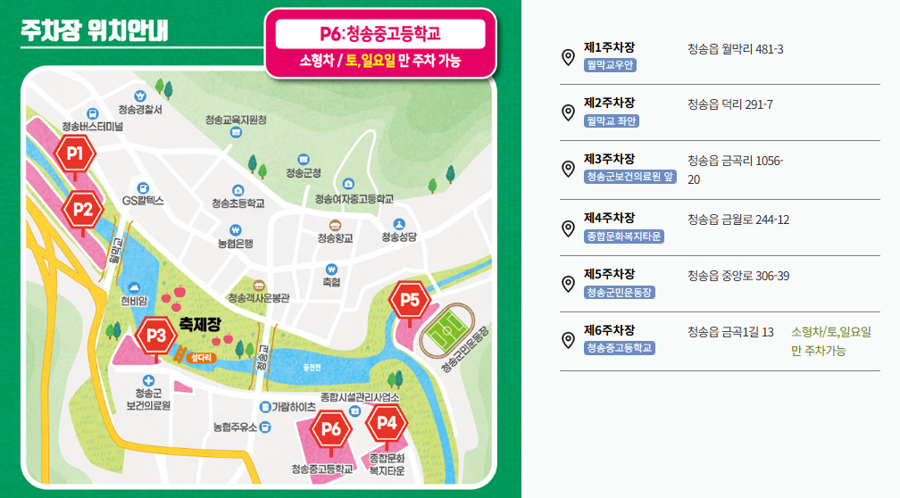 축제 당일 방문 시 주차 및 교통이 혼잡할 수 있으므로 이른 시간 출발 또는 대중교통 이용을 추천한다. 축제장 위치는 경북 청송군 청송읍 월막리 362번지이다.
