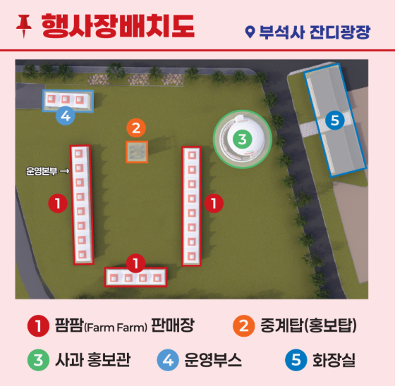 행사장에는 팜팜 판매장, 농특산물 홍보관 등이 마련되어 영주시 19개 읍면동 참여 농가의 대표 상품이 전시‧판매됩니다.