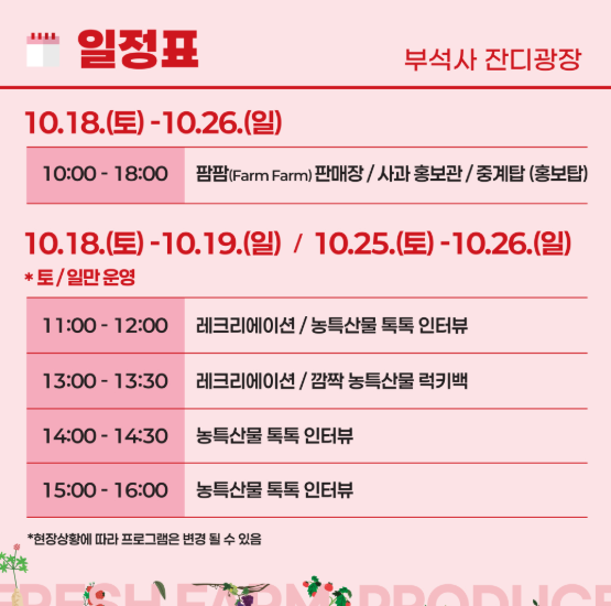 주변에는 부석사, 소백산 등 자연 관광지가 있어 축제 방문과 함께 1박 2일 코스로 여행 계획을 세우기에도 좋습니다. 끝으로 구매 희망이 있는 분들은 현장 판매관에서 신선 농산물과 특산품을 비교‧체험 후 선물 및 쇼핑 기회를 잡는 것을 추천합니다.