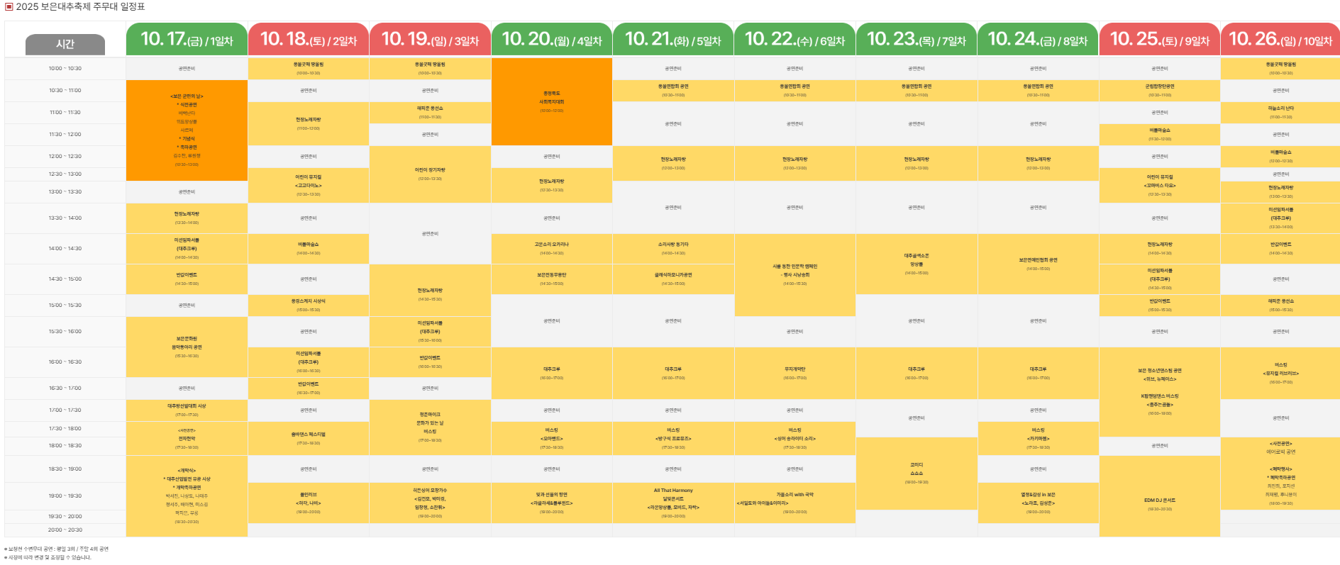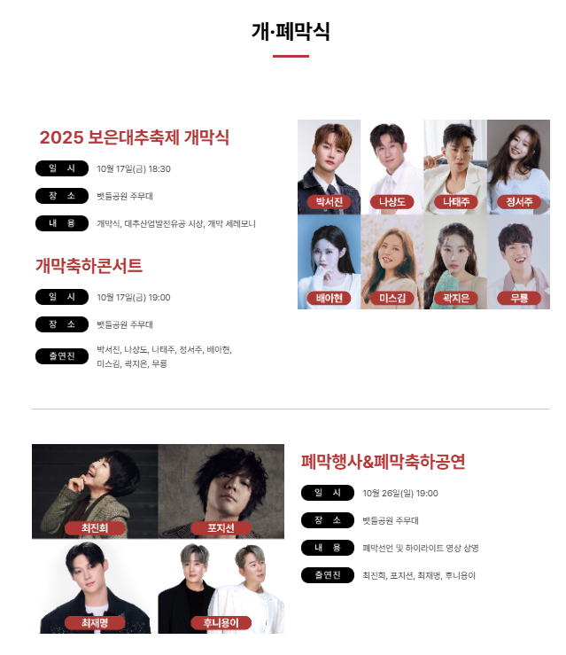 2025년 보은대추축제는 충북 보은군 보은읍 보청천 및 속리산 잔디공원 일원에서 10월 17일(금)부터 10월 26일(일)까지 총 10일간 열린다.