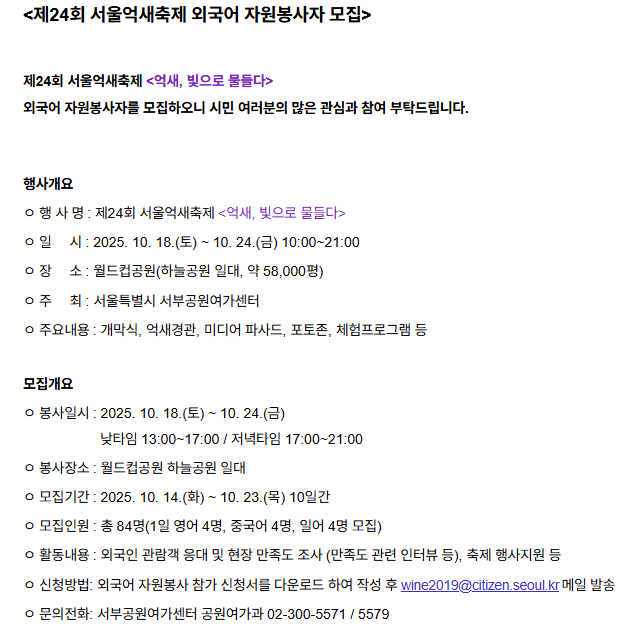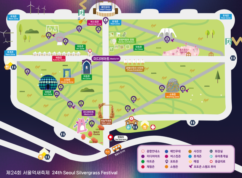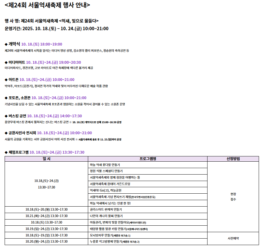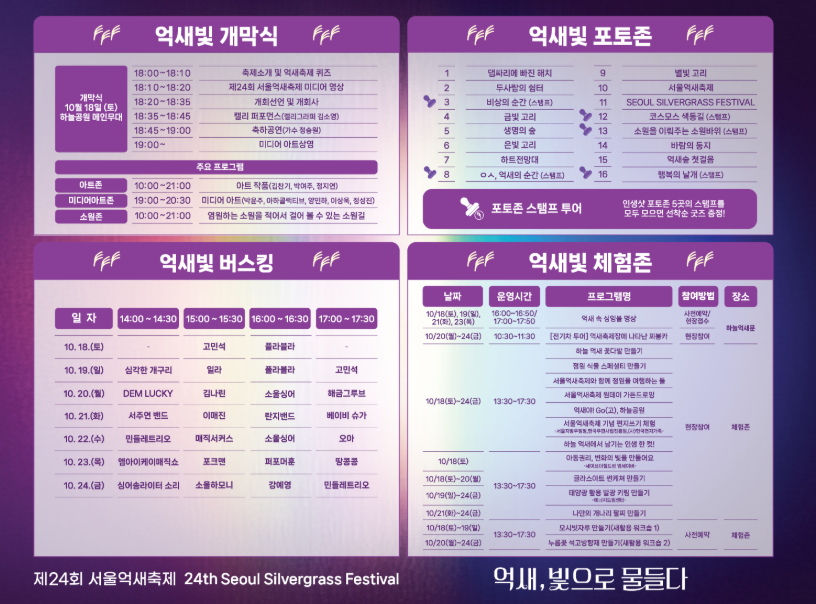 서울 마포구 상암동 하늘공원에서 열리는 서울억새축제는 2002년부터 이어져 온 서울 도심 속 가을 대표 축제입니다. 올해 제 24회째를 맞이하며 행사명은 억새, 빛으로 물들다로, 약 6만 평 규모의 억새밭이 은빛 물결을 이루는 장관을 배경으로 미디어아트, 포토존, 버스킹 공연 등이 어우러집니다.