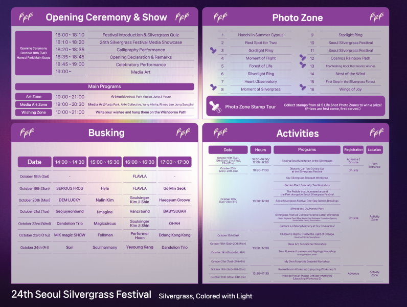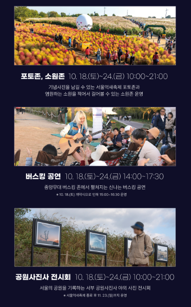 인기 포토존과 체험 프로그램이 마련되어 있으므로 사진 촬영용 간이 의자나 삼각대(휴대용)를 챙기면 좋습니다. 일부 체험은 사전예약이 필요하므로 관련 홈페이지나 안내부스를 미리 확인해 주세요.