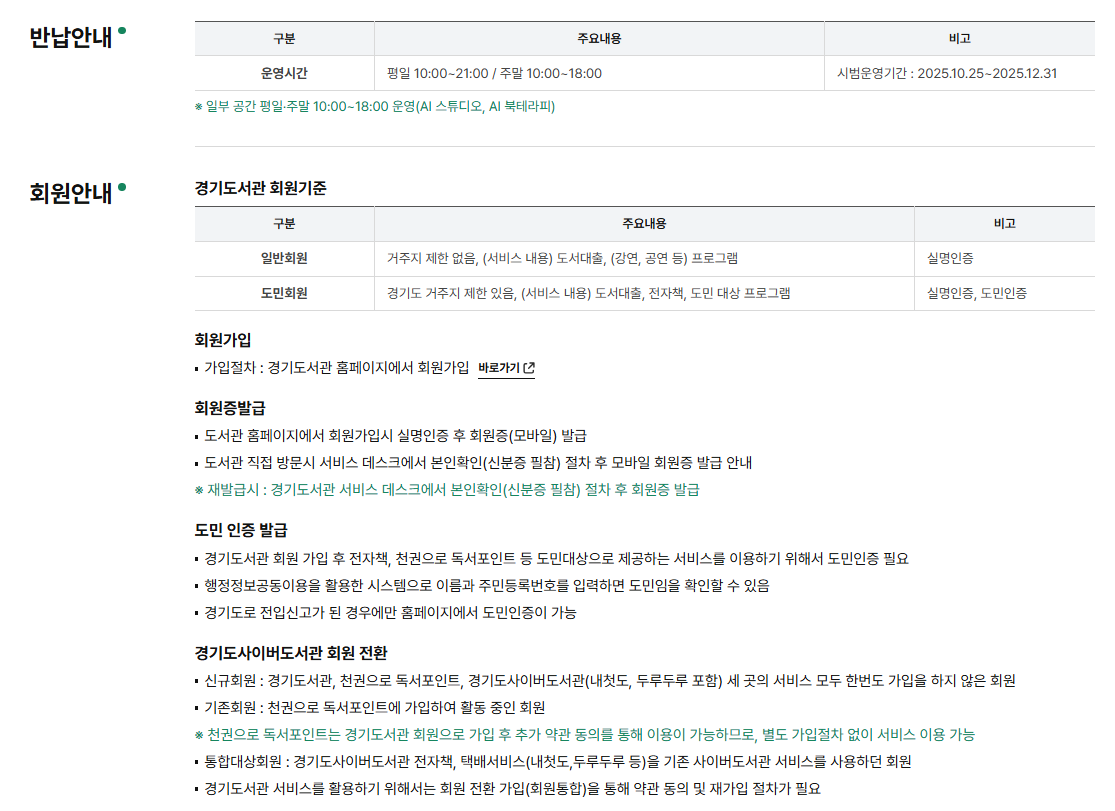 현재 경기도서관은 시범운영 기간으로 다음과 같은 운영시간 및 제도가 마련돼 있다.