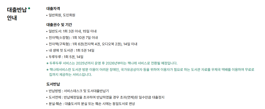 회원제도: 일반회원은 실명인증만으로 가입 가능하며, 도민회원은 거주지 인증이 추가된다. 시범운영 중에는 일반회원 기준으로 1회 3권 대출, 대출기간 15일이다. 내년부터는 1회 5권·7일 연장제도가 도입될 예정이다.