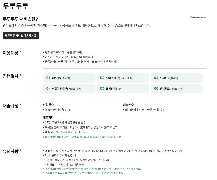 기타: 임신부·12개월 이하 영유아·등록장애인 대상 내생애첫도서관 또는 두루두루 무료 택배 서비스 등이 마련되어 있어 어린 자녀가 있는 가정에는 특히 유용하다.