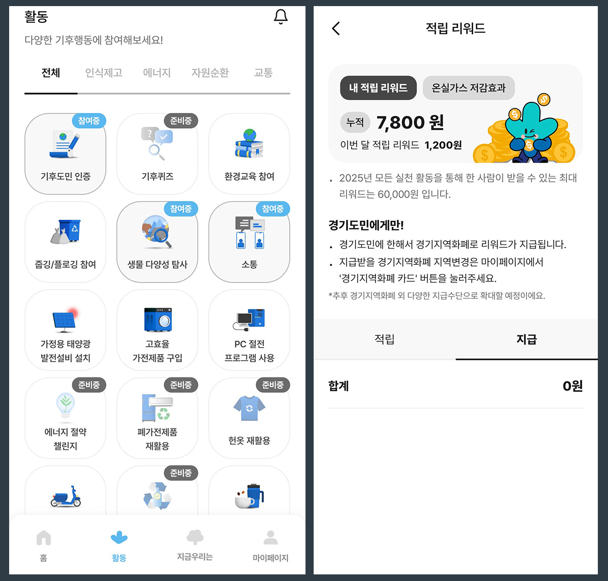 작은 실천이 지구를 살리고, 나에게 리워드로 돌아오는 경기도의 기후행동 기회소득 제도는 지속가능한 삶을 위한 새로운 모델이다.