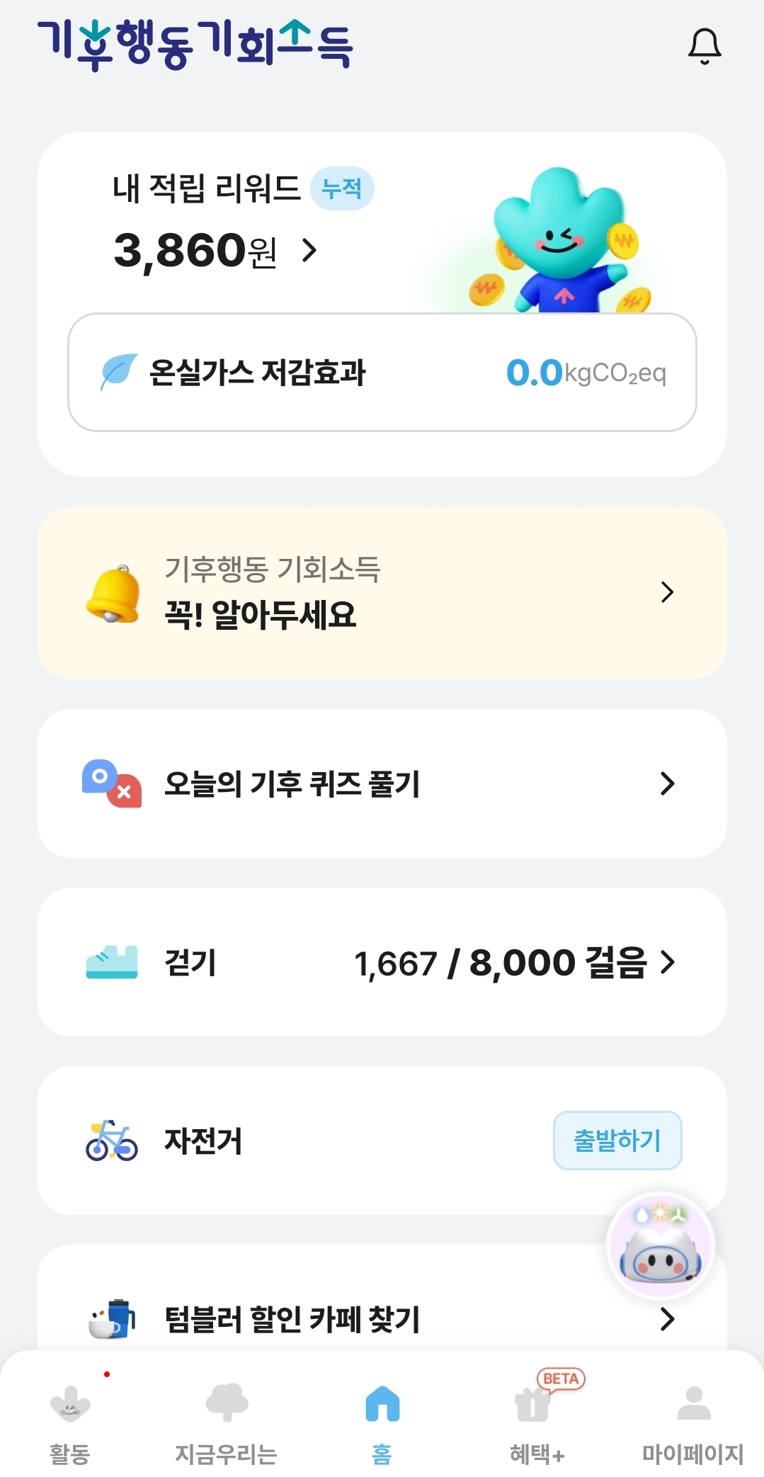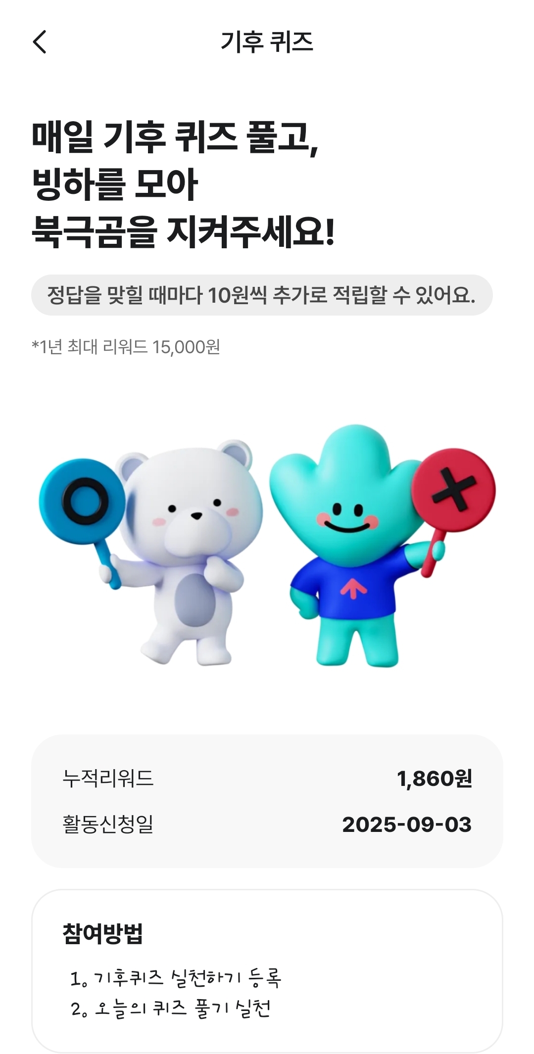 - 기후행동 퀴즈 : 매일 제공되는 오늘의 퀴즈참여 시 리워드 지급