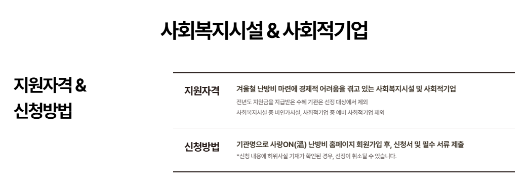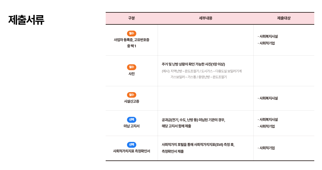 사회복지시설 : 정부 신고된 사회복지시설로 난방비 부담이 큰 기관(비인가 시설은 제외 가능).