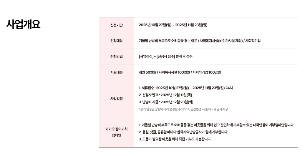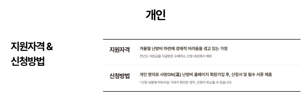 개인가구 : 겨울철 난방비 마련이 어려운 에너지 취약계층 (예: 기초생활수급자, 차상위계층, 법정한부모가족 등). 전년도 동일사업 수혜자는 제외될 수 있음.