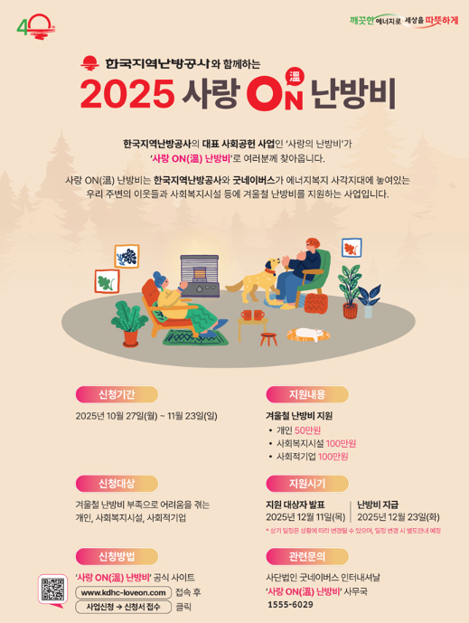 한국지역난방공사와 굿네이버스가 함께 진행하는 사랑ON 난방비는 겨울철 난방비 부담이 큰 가구·기관을 대상으로 실질 지원을 제공하는 에너지 복지 사업이다. 2025년 접수기간, 대상, 제출서류, 지급일을 한눈에 정리했다.