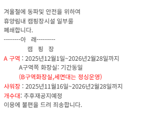 - 🔥 화기 사용 제한: 산불 위험기간(2~5월, 11~12월)에는 바비큐 금지