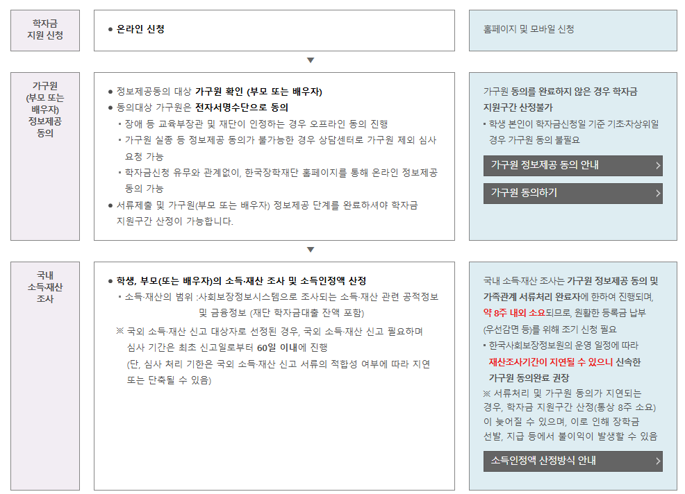 | 신청 방법 | 한국장학재단 홈페이지·모바일 앱에서 온라인 신청 후 가구원 정보 제공 동의 및 서류 제출 |