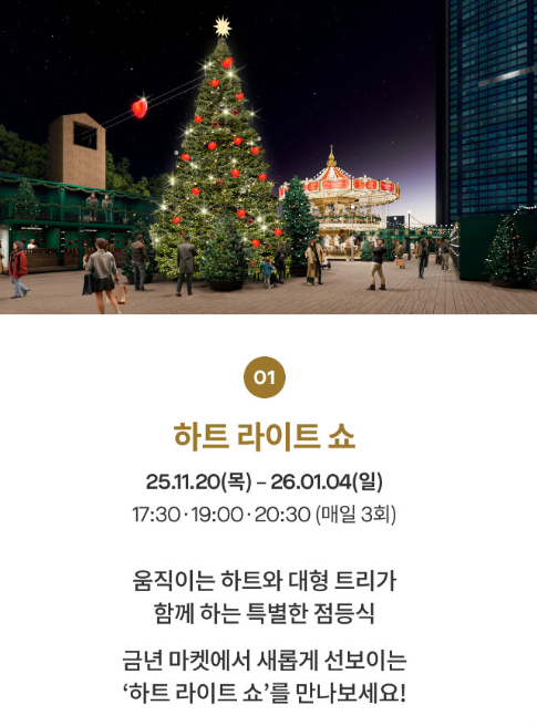 잠실 롯데월드타워 앞 월드파크 잔디광장에서 열리는 〈2025 롯데타운 크리스마스 마켓〉은 초대형 트리와 2층 회전목마, 하트 라이트쇼까지 더해진 도심형 겨울 축제다. 올해는 사전 예약제 입장권으로 운영되며, 낮에는 무료 입장, 저녁에는 유료 티켓제로 진행돼 연말 나들이·데이트·가족 외출 코스로 관심을 모으고 있다.
