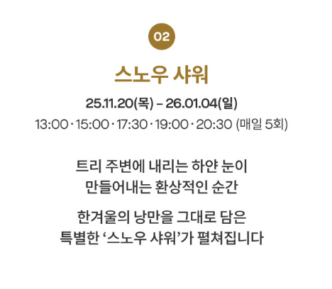 - 운영 시간 : 매일 11:30 ~ 22:00 예정 (라이트쇼·스노우 샤워는 저녁 시간대 집중 운영)
