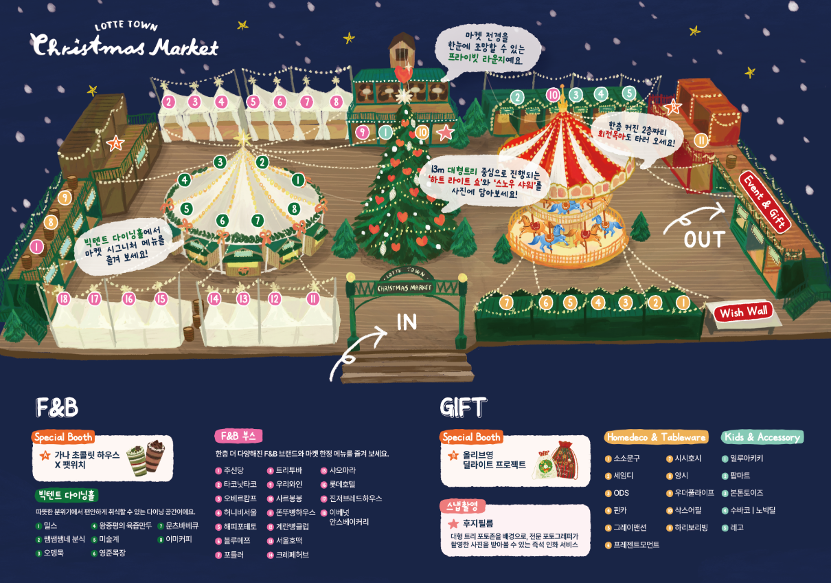 - 13m 초대형 트리 : 마켓 중앙에 위치한 상징적인 포토존으로, 야간 조명과 함께 사진 찍기 좋은 스폿이다.